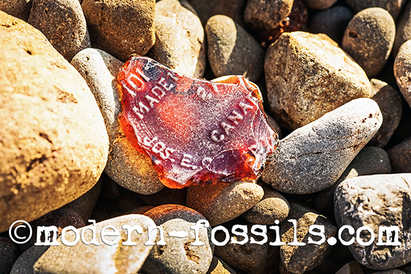 formations and will one day become, “Modern Fossils.” The tin has since dissolved and the glass has not. The glass is so thick you can dig-a-dig…dig and see nothing but green, red, blue, yellow and clear glass that has been frosted and smoothed through years of friction from changing tides.