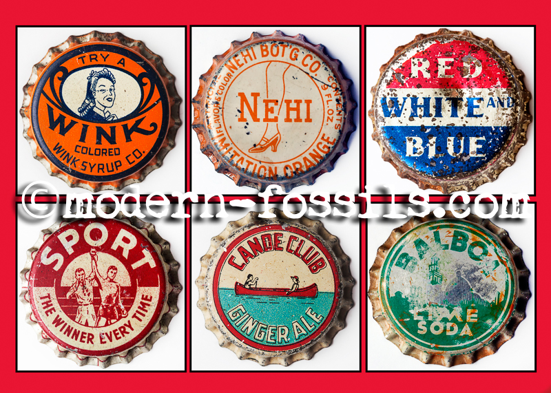 The implementaton of the bottle cap triggered the bottle to evolve and change shape from top to bottom; with their round bottoms and varied closing mechanisms to a dominant uniform shape that you see today. More fascinating than the evolving bottle and profit from a throwaway product are the images that fit within the small circular circumference of a bottle cap.Bottle Caps